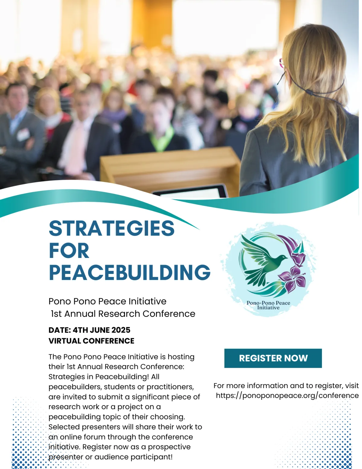 The Pono Pono Peace Initiative is hosting their 1st Annual Research Conference: Strategies in Peacebuilding online on June 4, 2025!